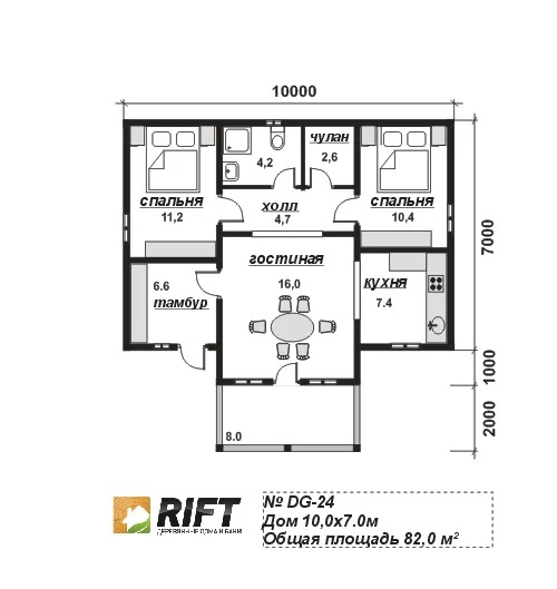 Приглашаем вас ознакомиться с новым проектом от компании Дом Рифт – Каркасный дом DG24. Этот уникальный дом представляет собой идеальное сочетание стиля и удобства. Это можно заметить в правильной планировке дома и его внешнем виде, благодаря добавлению крыльца и беседок. Площадь дома составляет 82 квадратных метров, предоставляя достаточно места для комфортной жизни. Мы используем передовые технологии строительства, включая Каркас. Это позволяет нам гарантировать вам долгое проживание здесь, без потребности в ремонте или реконструкции. Мы используем материалы, такие как [Материал] только от проверенных поставщиков, качество которых подтверждалось много лет. Этот проект имеет 1 этаж этажей и предлагает планировку, которая удобно распределяет разные зоны дома. Просторная большая гостиная размером 10×7 наполняется светом, позволяя наслаждаться времяпровождением с семьей, а уютная кухня станет сердцем вашего дома, где будет царить уют. Одним из главных преимуществ этого проекта является его короткий срок реализации – всего 30 дней дней. Это позволяет вам быстро осуществить свою мечту о собственном доме, минимизируя время ожидания и затраты на аренду или временное жилье. Сотрудничество с компанией Дом Рифт также выгодно благодаря доступным ценам на проекты. Цена дома составляет 2684000. Чтобы воплотить мечту в реальность, начиная всего с 42 944 вы можете купить дом в кредит. Приглядитесь к данному проекту dg24 и возможно именно он станет тем домом, о котором вы всегда мечтали. Стройте своё будущее с нами и наслаждайтесь комфортом и качеством жизни в вашем новом доме от Дом Рифт.